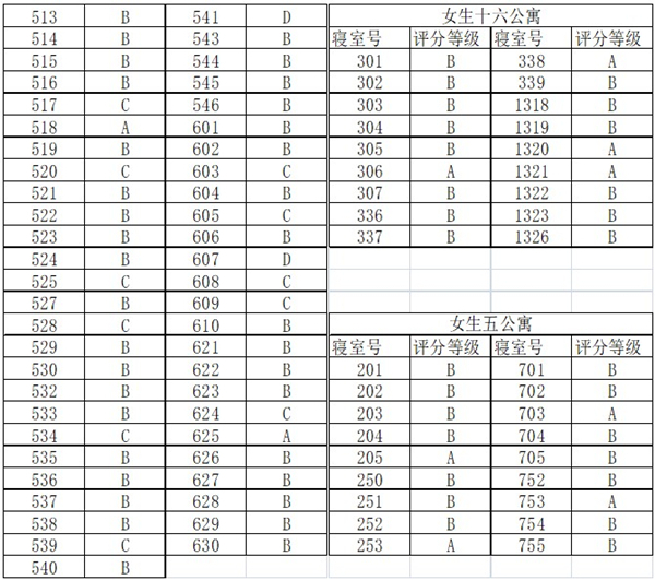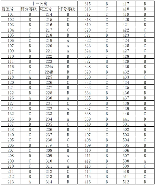 11月28日中午,航建学院学生会生活部开展了本学期第十三次寝室内务检查工作。其中118(17级),518(16级)卫生环境良好,院系寝室卫生较以前有明显进步,希望保持并继续进步,从而助力学习进步。附第十四周查寝成绩: