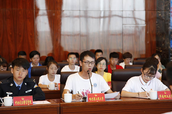 彩虹服务队队长江佳正作为团队代表发出青年声音。发言以“走出工程,走进右玉,走近一群可爱的人”为题,就“弘扬右玉精神,争做时代新人”,“关爱留守儿童,放飞七彩梦想”,“社会实践工作,我们一直在路上”三个方面讲述了彩虹服务队在此次百所高校右玉行中的实践经历、感受和成果,并提出了与当地留守儿童定期联系、长期帮扶的思路和举措。最后他以彩虹服务队誓词“哈尔滨工程大学彩虹服务队,践行诺言,服务社会,初心不改,矢志不渝,社会实践工作,我们一直在路上”作为结尾结束了汇报。