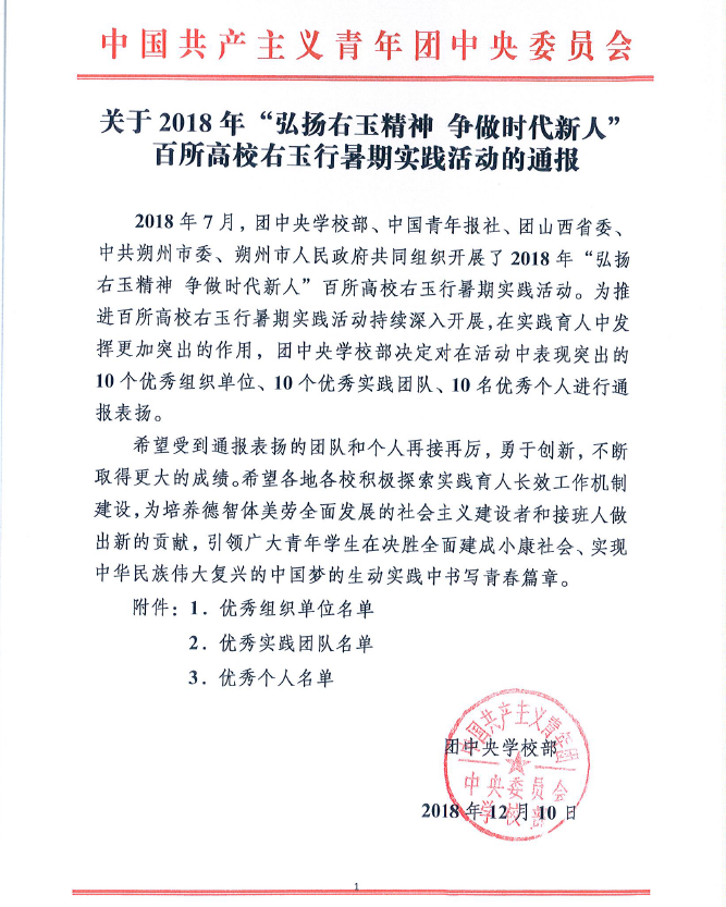 2018年7月,团中央学校部、中国青年报社、团山西省委、中共朔州市委、朔州市人民政府共同组织开展了2018年“弘扬右玉精神争做时代新人”百所高校右玉行暑期实践活动。为推进百所高校右玉行暑期实践活动持续深入开展,在实践育人中发挥更加突出的作用,团中央学校部决定对在活动中表现突出的10个优秀组织单位、10个优秀实践团队、10名统秀个人进行通报表扬,其中我院团委荣获优秀组织单位称号。