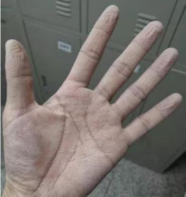一位医护人员脱下手套后,露出的一双被汗水侵湿的手掌,苍白发皱的表皮,揭示了数十小时的艰辛工作。