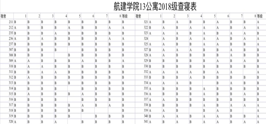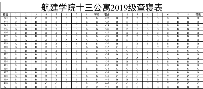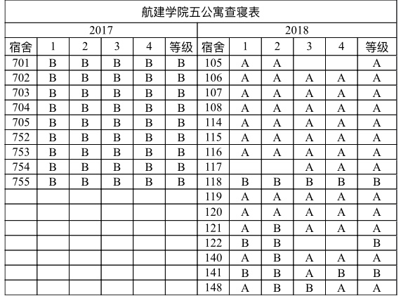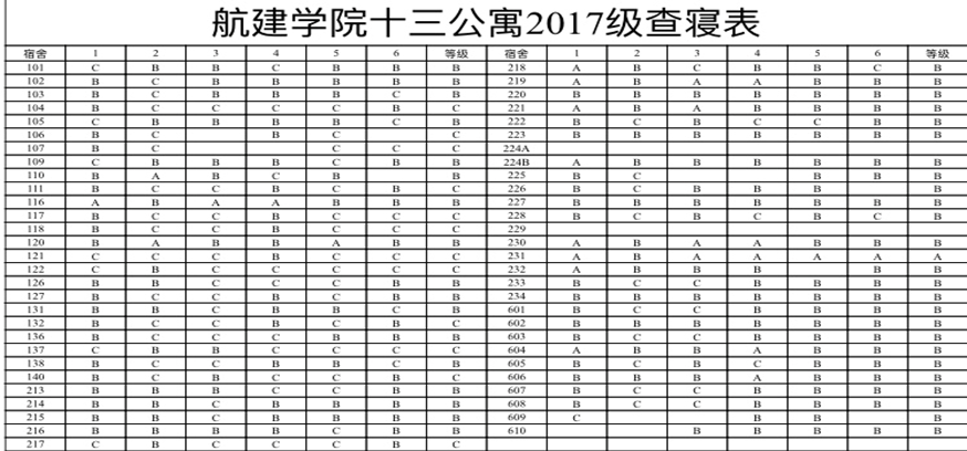 航建学院学生会生活部卫生安全检查采用哈尔滨工程大学卫生安全检查工作的统一标准,具体评判标准如下:A:90分及以上B:80-90分C:70-80分D:60-70分E:60分以下及未开寝室每次检查不进行复另附第十次(第十三周)查寝成绩及寝室照片:
