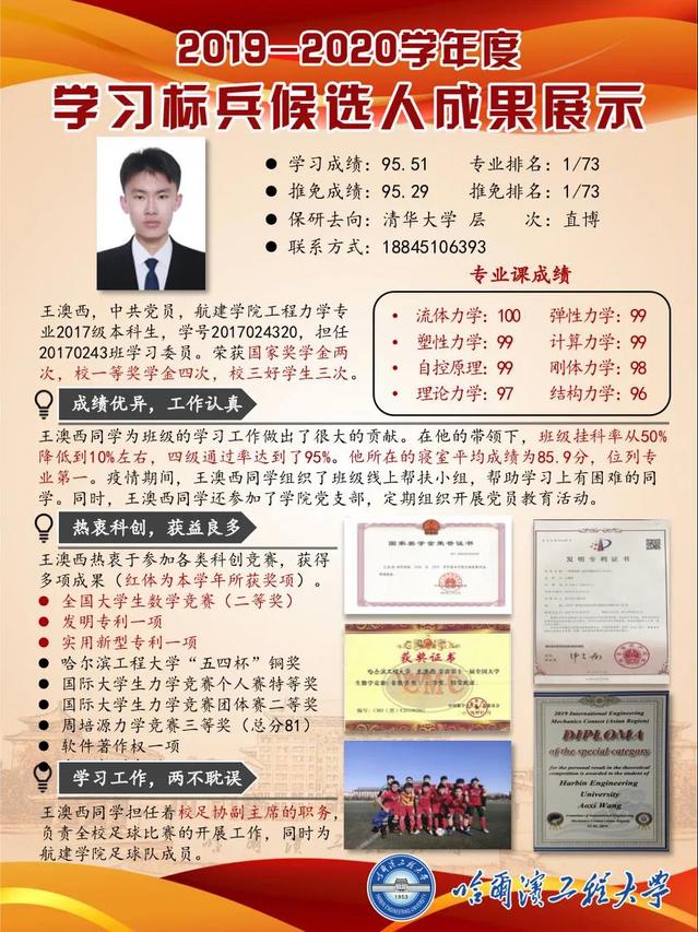 王澳西,2017级本科生,工程力学专业,担任20170243班学习委员,以95.51的学习成绩在专业中排名第一,直博层次保研至清华大学。他为班级的学习工作做出了很大的贡献。在他的带领下,班级挂科率从50%降低到10%,四级通过率达到95%。他所在的寝室平均成绩为85.9分,位列专业第一。他热衷于参加各类科创竞赛,获得多项成果,现拥有发明专利一项,实用新型专利一项,国际大学生力学竞赛个人赛特等奖和软件著作权一项。