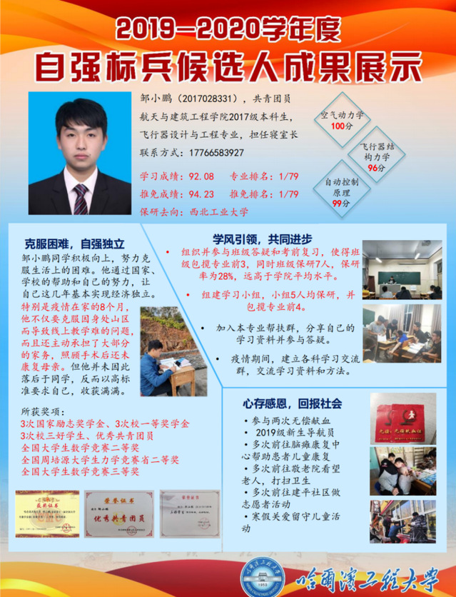 邹小鹏,2017级本科生,飞行器设计与工程专业,学习成绩92.08,专业排名第一,保研至西北工业大学。他组织并参与班级答疑和考前复习,使得班级包揽专业前3,同时班级保研7人。科创方面获得全国大学生数学竞赛二等奖,全国周培源大学生力学竞赛省二等奖和全国大学生数学竞赛三等奖在生活中他积极向上,努力克服生活上的困难。他通过国家、学校的帮助和自己的努力,让自己这几年基本实现经济独立。特别是疫情在家的8个月,他不仅要克服因身处山区而导致线上教学难的问题,而且还主动承担了大部分的家务,照顾手术后还未康复母亲。但他并未因此落后于同学,反而以高标准要求自己,收获满满。