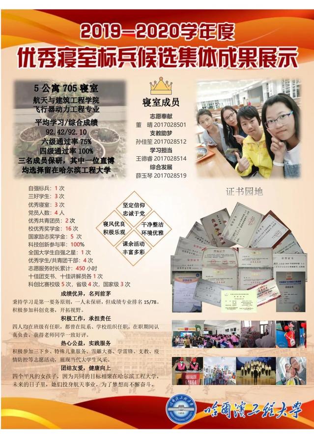 5公寓705寝室为2017级本科生寝室,三名成员保研,其中一位直博均选择留在哈尔滨工程大学。寝室四人平均学习92.4,六级通过率75%,四级通过率100%。四人均在班级有任职,都曾在院系、学校组织任职。在职期间认真负责,获得老师同学一致好评。她们积极参加三下乡、特殊儿童服务、雪雕大赛、学雷锋、支教、疫情防控等志愿活动,展现当代大学生风采。未来的日子里,她们投身航天事业,为了梦想而不懈奋斗。