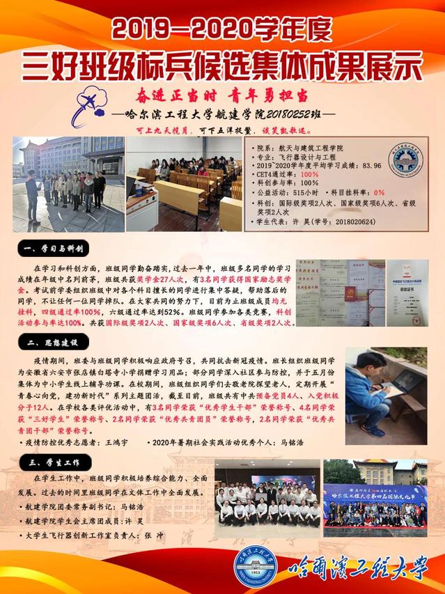 20180252班为2018级本科生班,飞行器设计与工程专业,班级平均学生成绩83.96,四级通过率100%,专业课和专业选修课挂科率0%,科创参与率100%。班级成员共获国际级奖项2人次、国家级奖项6人次、省级奖项2人次,2019~2020学年度获奖学金27人次。班级现有中共党员4名,预备党员4名,班级建设工作成员参与率极高。在学生工作方面班级成员全民发展,马铭浩同学现任航建学院团委常务副书记,许昊同学现任航建学院学生会主席团成员,张冲同学现任大学生飞行器创新工作室负责人。