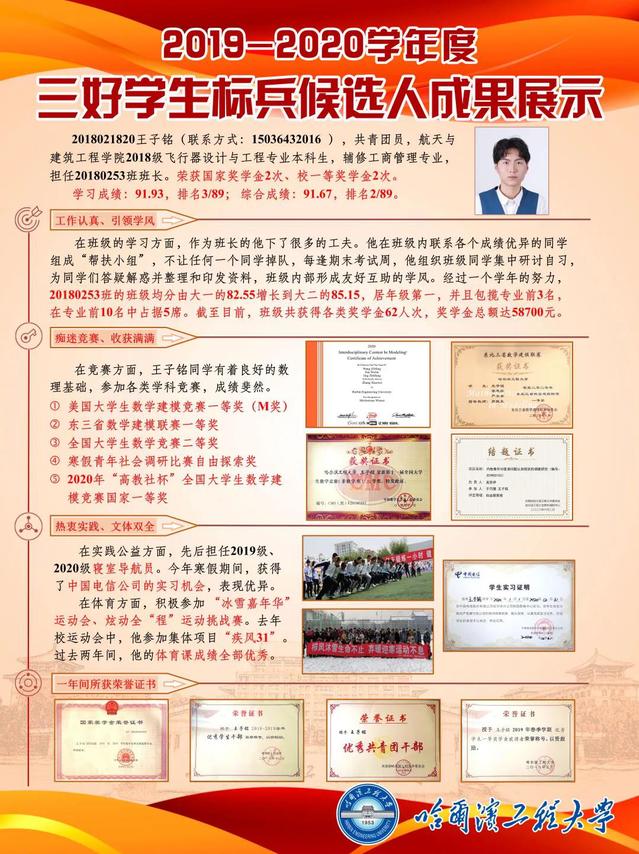 王子铭,2018级本科生,飞行器设计与工程专业,担任20180253班班长,大二学年学习成绩91.93分荣获国家奖学金2次。在竞赛方面,王子铭同学有着良好的数理基础,参加各类学科竞赛,成绩斐然。获得美国大学生数学建模竞赛一等奖(M奖)、东三省数学建模联赛一等奖和全国大学生数学竞赛二等奖等多类奖项。班级建设方面,经过一个学年的努力,20180253班的班级均分由大一的82.55增长到大二的85.15,居年级第一。