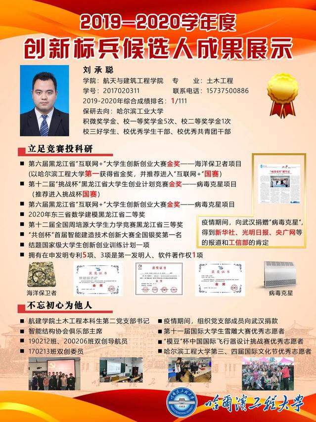 刘承聪,2017级本科生,土木工程专业,2019-2020年综合成绩排名专业第一。科创方面。在第六届黑龙江省互联网+大学生创新创业大赛中以“海洋保卫者项目”荣获金奖,在第十二届挑战杯黑龙江省大学生创业计划竞赛以“病毒克星项目”荣获金奖,在第六届黑龙江省互联网+大学生创新创业大赛以“病毒克星项目”荣获金奖。疫情期间,向武汉捐赠病毒克星,得到新华社、光明日报、央广网等的报道和工信部的肯定。现拥有在申发明专利5项、3项是第一发明人、软件著作权1项。