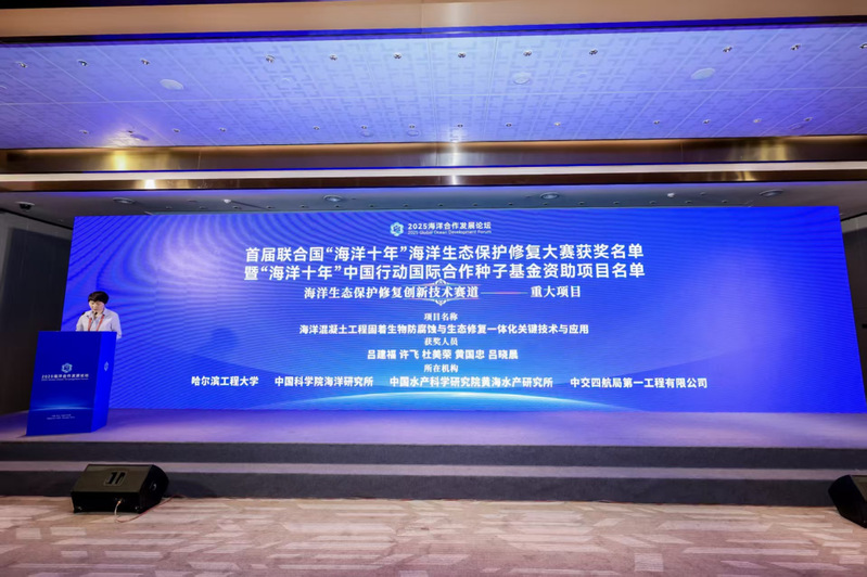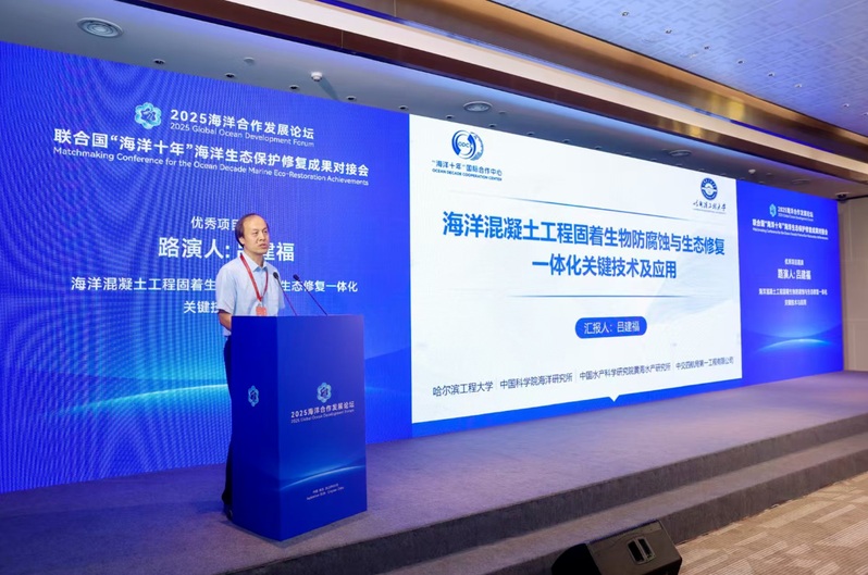 近日,作为2025海洋合作发展论坛特色活动之一的联合国“海洋十年”海洋生态保护修复成果对接会在青岛举行。哈尔滨工程大学航天与建筑工程学院土木与环境工程系吕建福教授主持的项目“海洋混凝土工程固着生物防腐蚀与生态修复一体化关键技术与应用”,获得首届联合国“海洋十年”海洋生态保护修复大赛——创新技术赛道“海洋十年”中国行动国际合作种子基金重大项目(仅4项),同时被评为大赛优胜项目并进行了路演汇报。学校作为该赛道全国唯一牵头高校现场进行路演汇报。