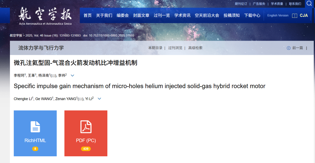 近日,哈工程航天与建筑工程学院先进固体动力技术团队的研究成果《微孔注氦型固-气混合火箭发动机比冲增益机制》入选宇航领域顶级期刊《航空学报》亮点文章。文章论述了团队在固体动力运载火箭发射中,提出注氦型固-气混合火箭发动机概念,大幅提升发动机单位冲量的同时,实现推力的实时调节,大大提升了固体动力运载火箭的能效。