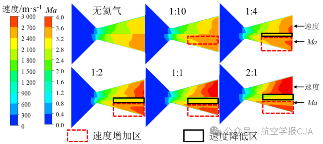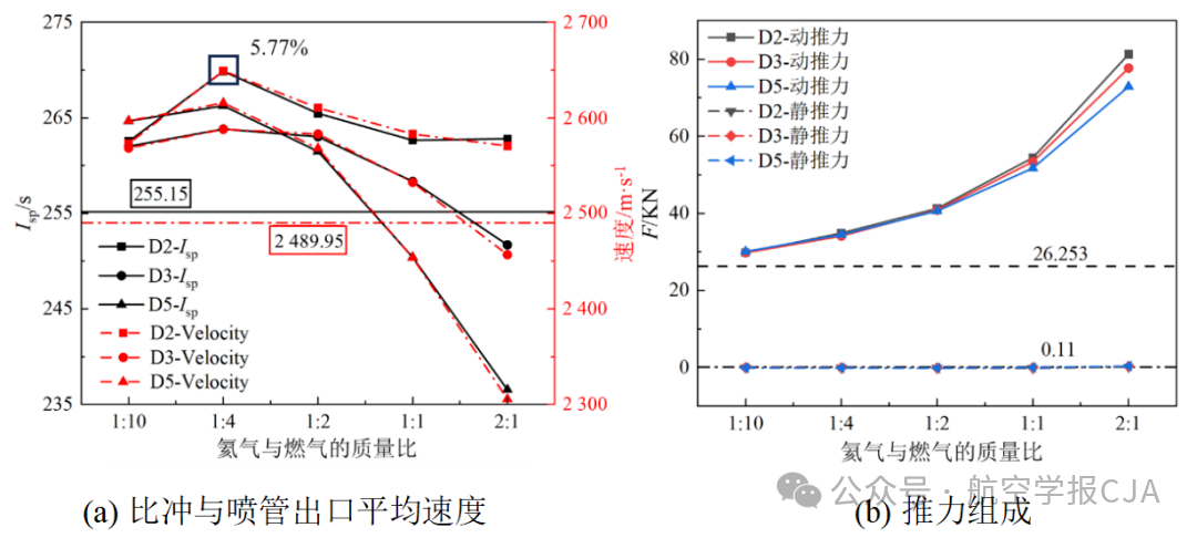 据文章的第一作者哈工程航建学院博士生李程珂、通讯作者哈工程航建学院杨泽南副教授介绍,团队通过长期研究,找到了对火箭发动机注入氦与燃气之间的“黄金”比例1:4,可使发动机单位冲量提升5.77%。通过调整氦气注入多少,就可以实现发动机的推力调节。当改变氦气注入比例从0到2:1,最高可实现100%-313%的最大推力调节范围。