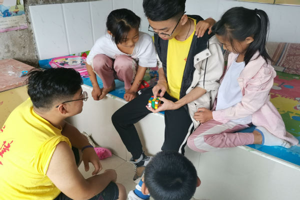 在走访的过程中,彩虹服务队队员们给孩子们带去了学习生活用品并与孩子们进行了亲切的交谈,了解了一些他们学习生活中的情况与问题,同时队员们还客串了一下辅导老师,为他们进行课业辅导。在与队员们的聊天和游戏中,孩子的话开始渐渐变多,他分享了自己的生活,给队员们讲述自己学校中的趣事,还带来了自己的朋友。仅仅一个上午,孩子便已视队员们为朋友,带队员们熟悉村子的环境。队员们给孩子讲述自己的大学生活,与孩子畅谈梦想。队员们感受到孩子的孤独,同时也更感受到了他的坚强,相较于物质上的匮乏,孩子们更缺少的是交流与关怀。